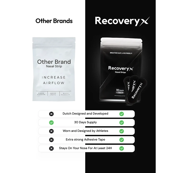 RecoveryX Nose Strips open your nasal passages so you can breathe deeply through your nose, the way your body is designed to. More oxygen, less effort, better sleep.